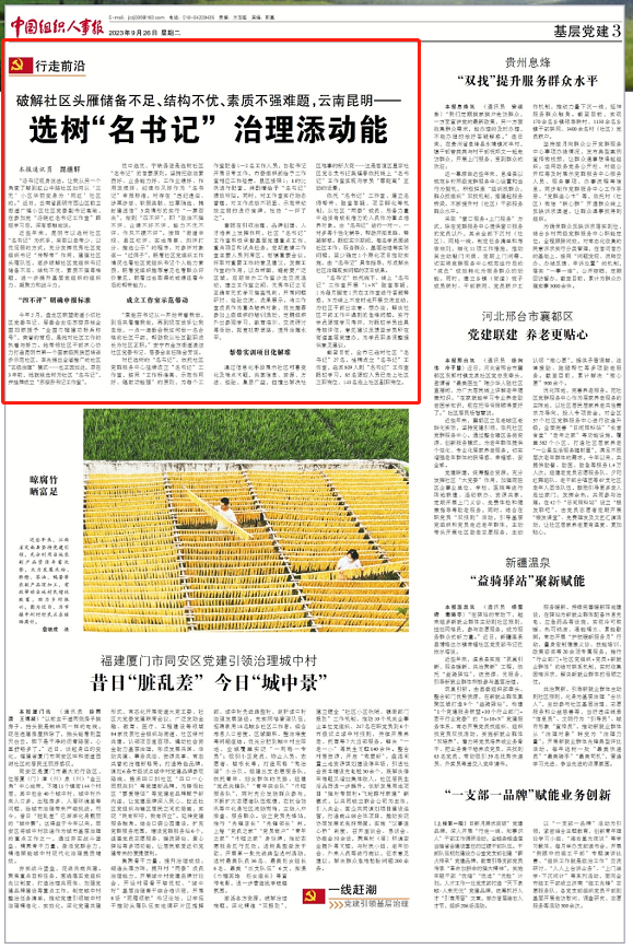 9月26日,《中国组织人事报》刊发题为《破解社区头雁储备不足、结构不优、素质不强难题,云南昆明——选树“名书记” 治理添动能》的文章,点赞昆明选树社区“名书记”。