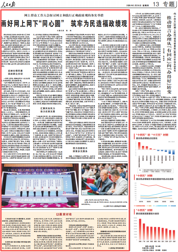 3月26日,《人民日报》专题版聚焦日前在云南省昆明市举行的网上群众工作大会,各地党政干部、专家学者会聚一堂,探讨树立和践行正确政绩观的务实举措,走好网上群众路线的实践路径。