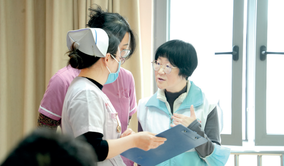 医务社工杨蕾(右一)与医护人员讨论服务计划。 云南省委社会工作部供图